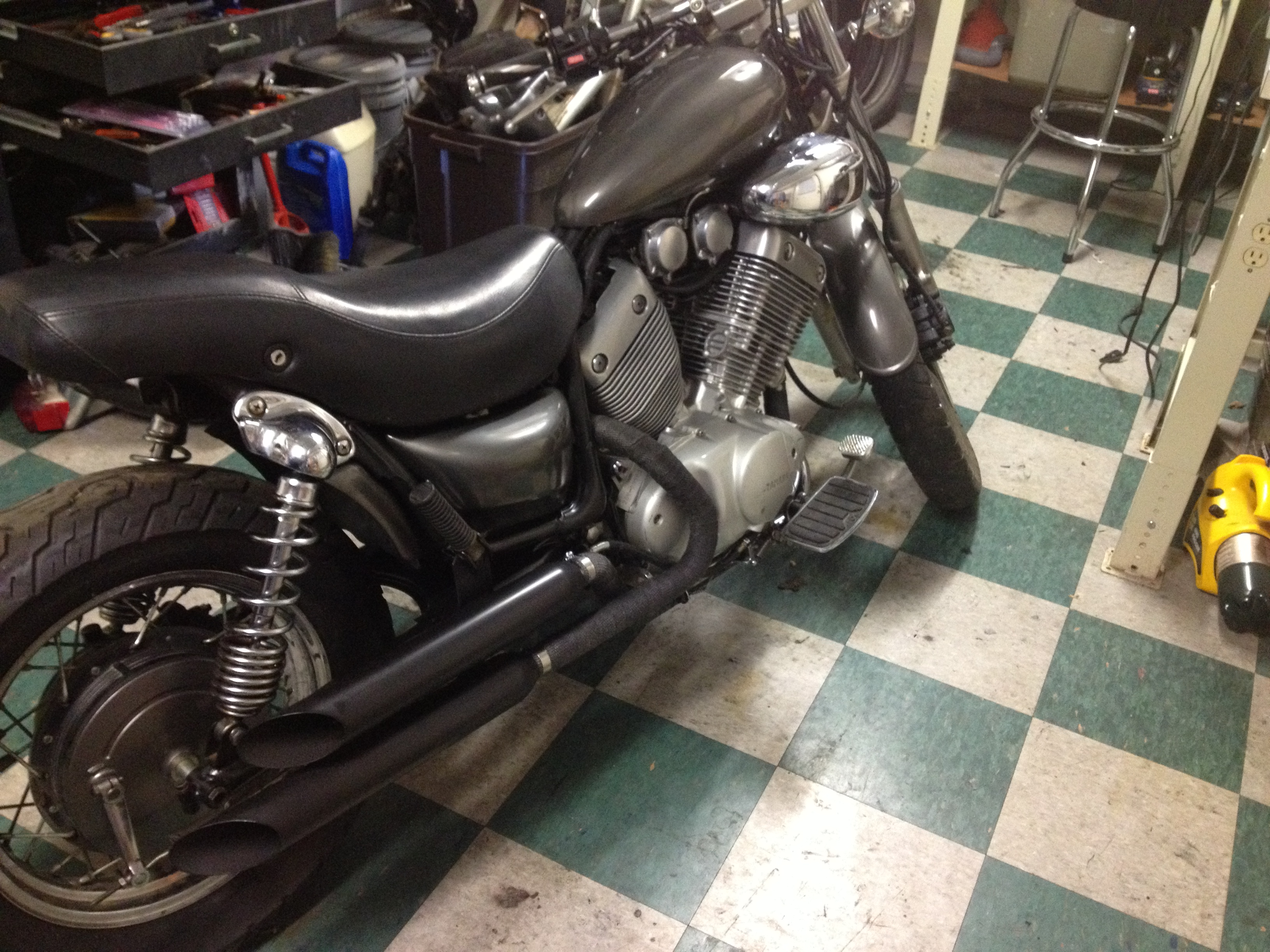 I found a set of Jardine open pipes on ebay. The paint was failing, so I just wrapped them with header wrap and painted the ends with Bar-B-Q paint. I also added a very small tail light and tiny turn signals I purchased off ebay. They were almost useless they were so small, but they looked good. My thought the build were minimalist – remove everything you don’t need and make what you keep smaller and lighter. This way you look like you strapped a seat to an engine! I was trying to figure out a springer seat – but never got there…