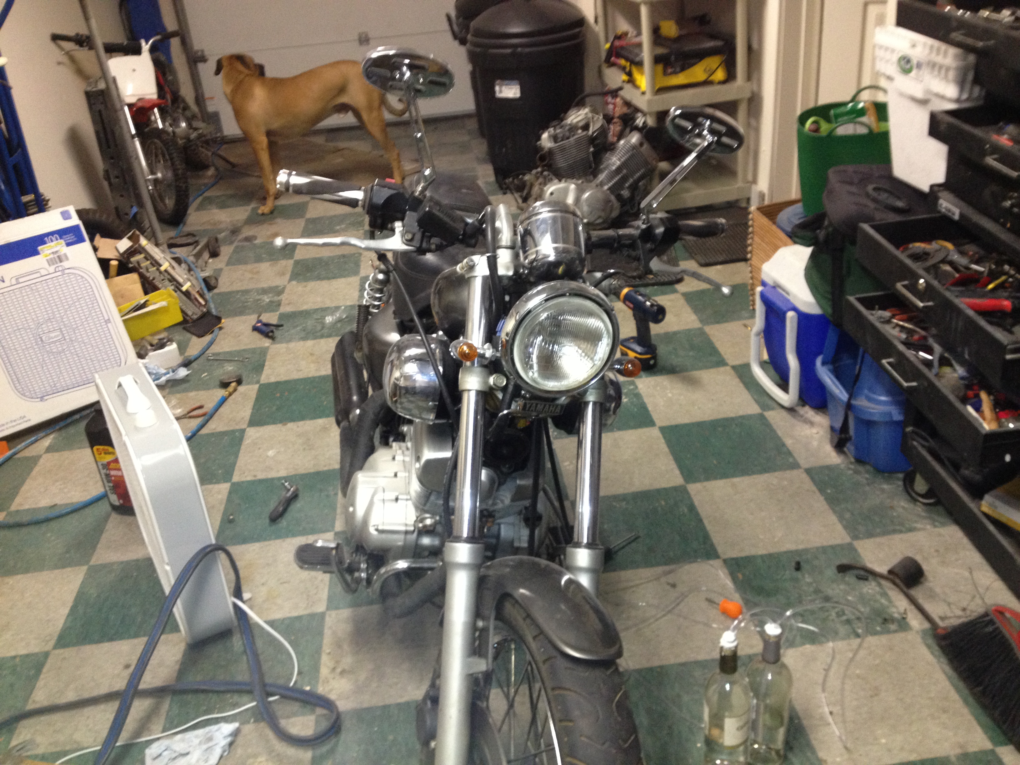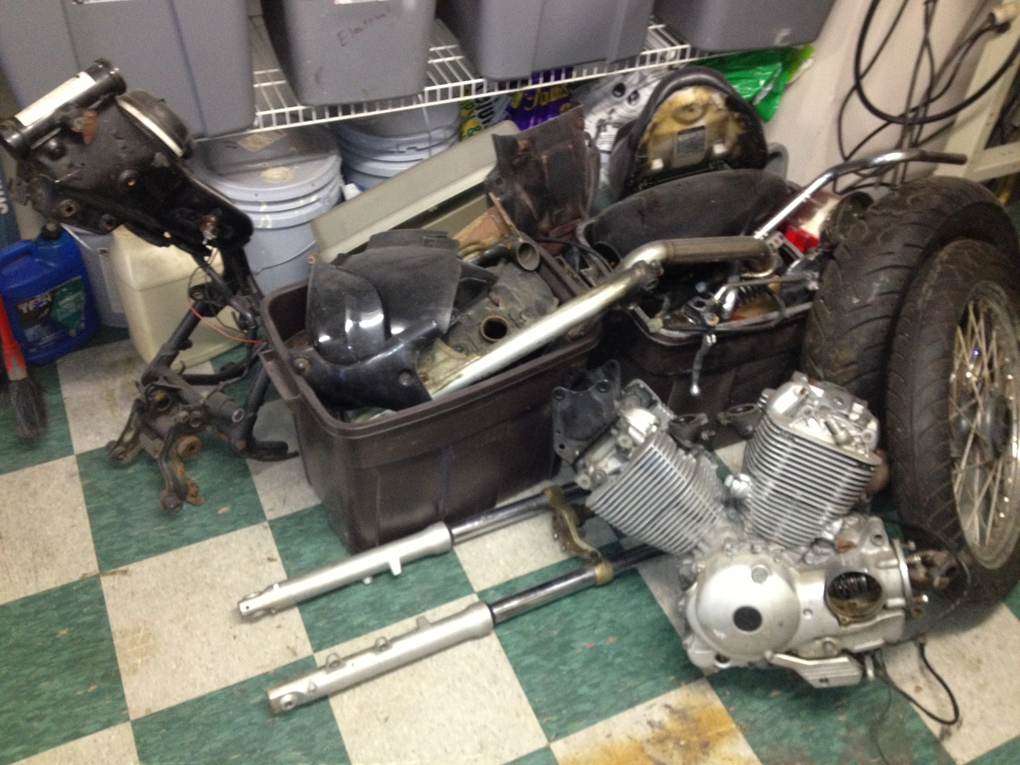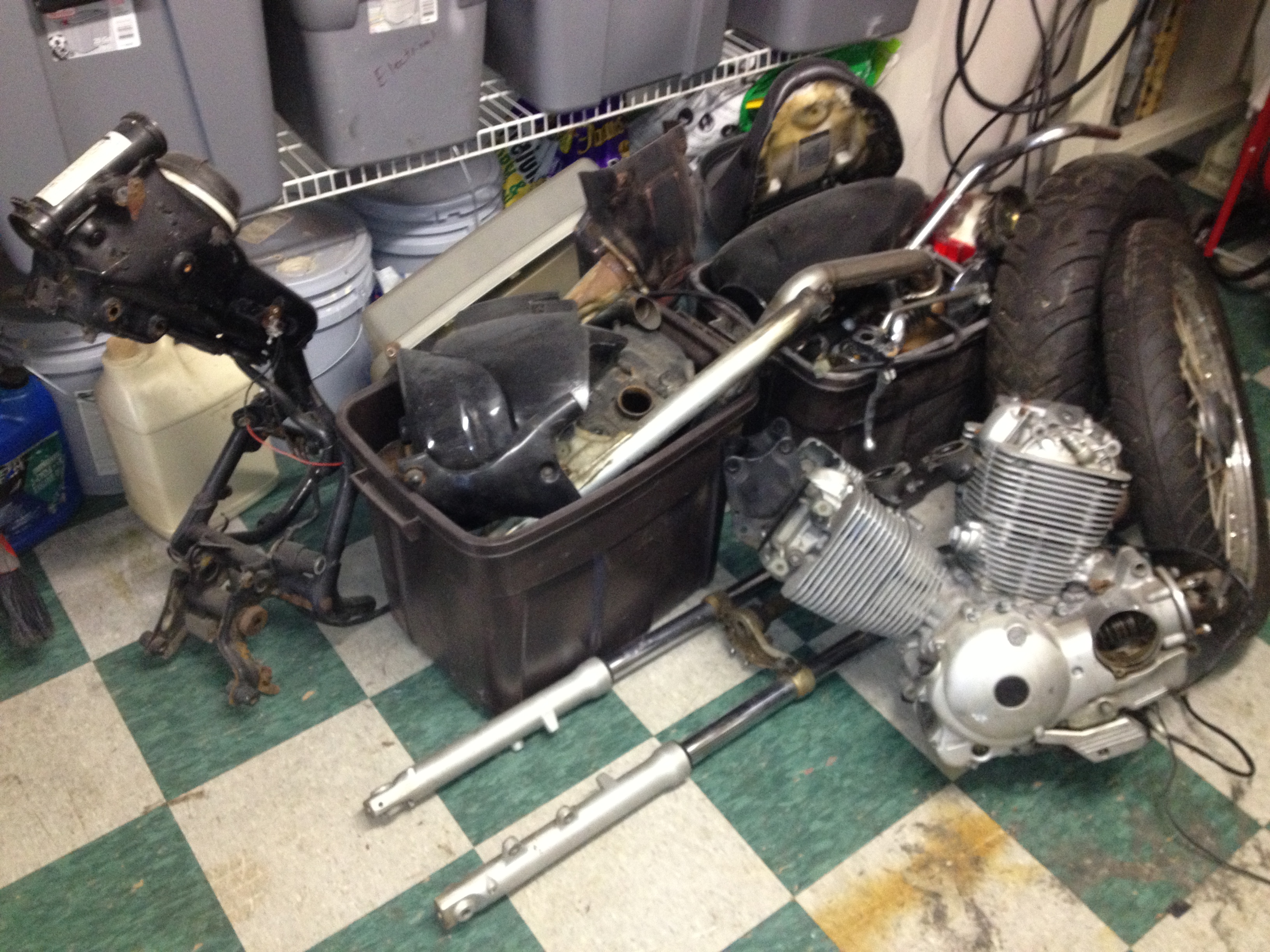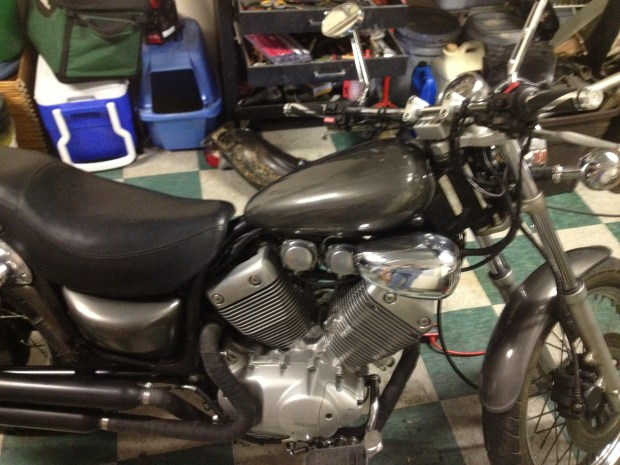 I kept working at it, and finally it started looking like a motorcycle instead of a plastic tote full of parts. I painted the body covers with spray paint – they actually came out looking pretty good for rattle can.
